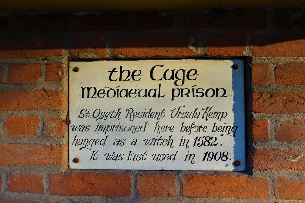 The Cage, according to the St Osyth Museum website, “is a former village lockup where drunks and villains would be kept overnight. It is claimed that Ursula Kempe was detained here in 1852 whilst being interrogated over false accusations of withcraft. We know of no evidence to support this, but she certainly was interrogated in St Clere’s Hall. Ursula was hanged in Chelmsford together with another St Osyth woman Elizabeth Bennett.”